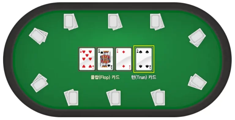 - 2차 배팅 종료 후 딜러는 중앙에 오픈 된 플랍 카드에 추가로 턴 카드 1장을 오픈합니다.